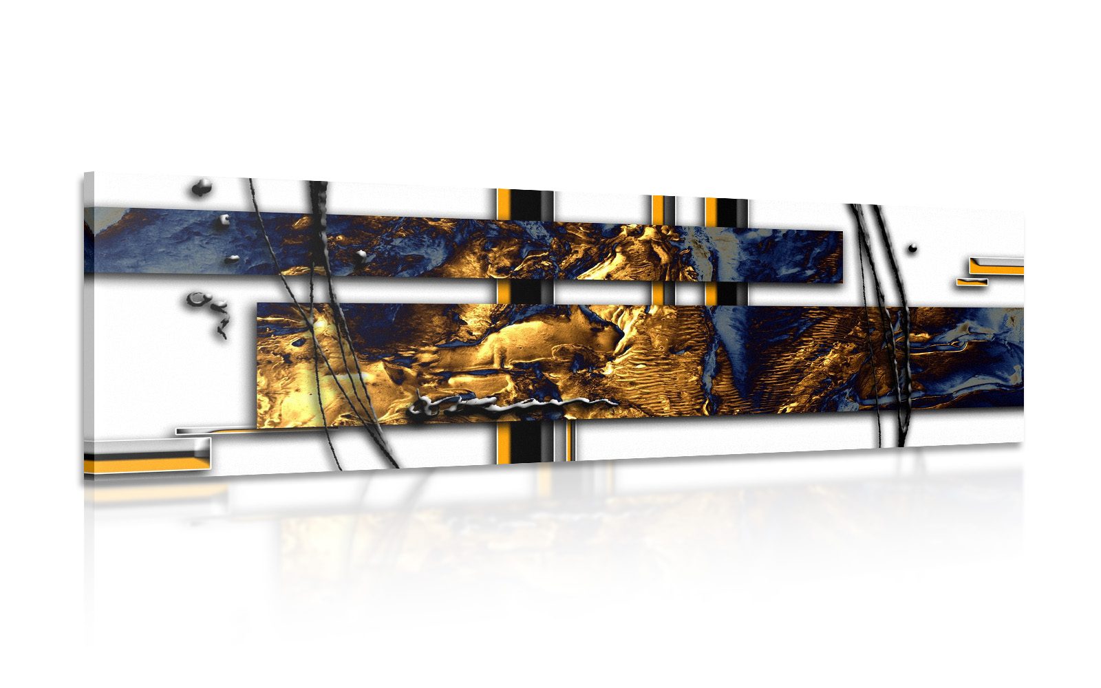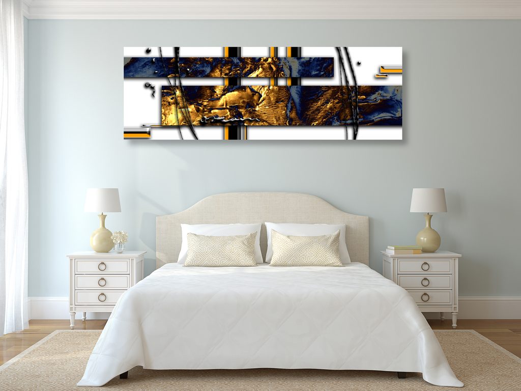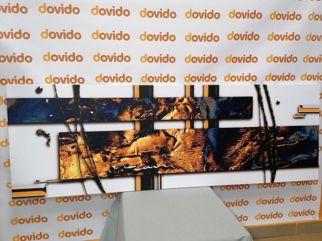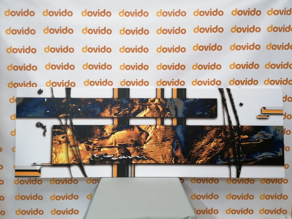 Ta slika predstavlja luksuzno abstrakcijo z modernim dizajnom. Glavni elementi so kombinacija zlatih in modrih tonov, ki ustvarjajo fascinantno teksturo in dinamiko. Čiste linije in geometrijske oblike dodajajo delu eleganten in sofisticiran videz. Idealno se prilega interierjem z modernim stilom, kjer poudari atmosfero elegance in okusa. Slika je izdelana iz kakovostnih materialov, kar zagotavlja njeno dolgo življenjsko dobo in privlačen vzhod.